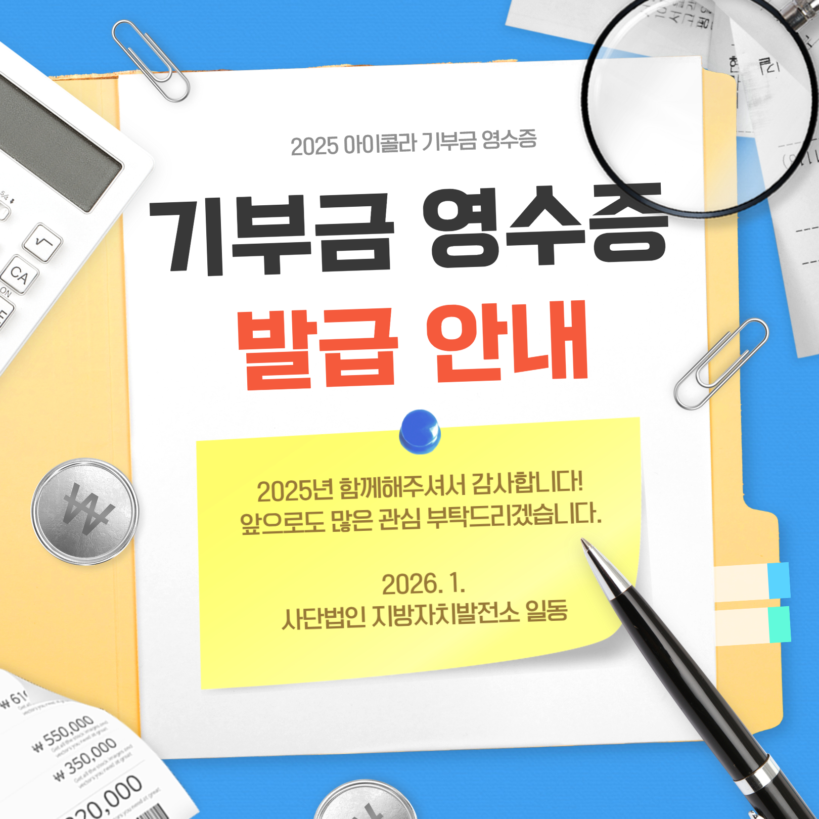 📢 2025 기부금영수증 안내2025년 한해도 사단법인 지방자치발전소 관심과 후원으로 함께 해 주셔서 감사드립니다.연말정산을 준비하시는 분들을 위해 기부금영수증 발급과 관련한 사항을 아래와 같이 안내드립니다.💡기부금영수증 발급 대상 - 2025년 1월 1일 ~ 12월 31일 사이 후원해 주신 모든 후원자님 (기부일자 기준) - 기부금영수증은 후원자 본인 명의로 발급 (타인 명의발급 불가)💡기부금영수증 발급을 위한 정보 등록 - 올해 연말까지 관련 정보(주민등록번호, 사업자등록번호) 등록 필요 - 정보가 등록된 후원자의 기부내역은 2026년 1월 중순 국세청 홈택스 자동 업데이트💡기부금영수증 발급 방식 - 국세청 홈택스 서비스 1) 2026년 1월 중순부터 국세청 홈택스를 통해 기부..