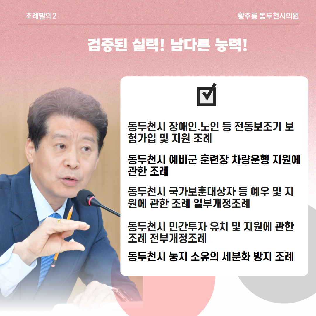 - 조례 : 대표발의, 공동발의 조례 재·개정안 소개 및 의의 설명