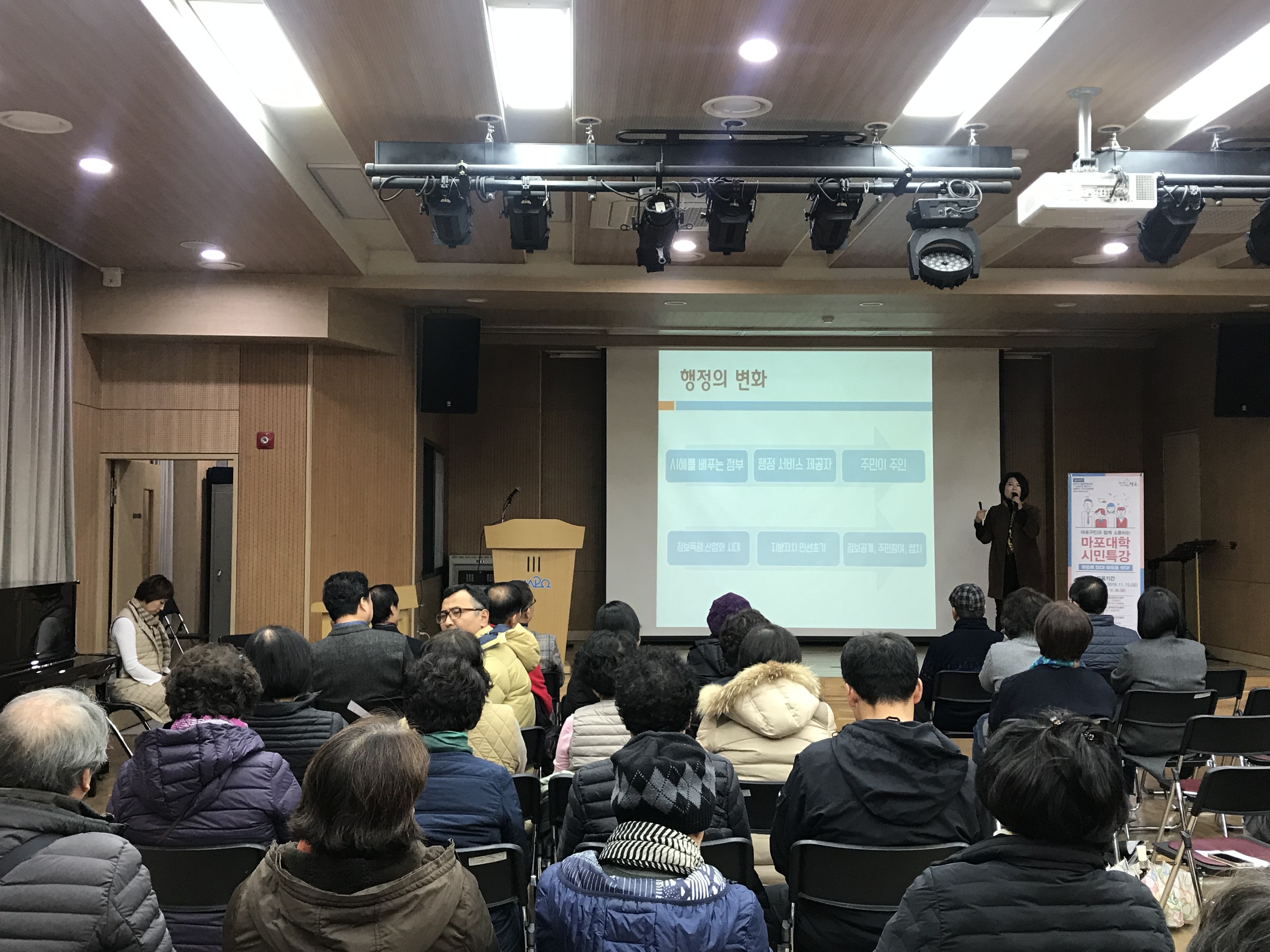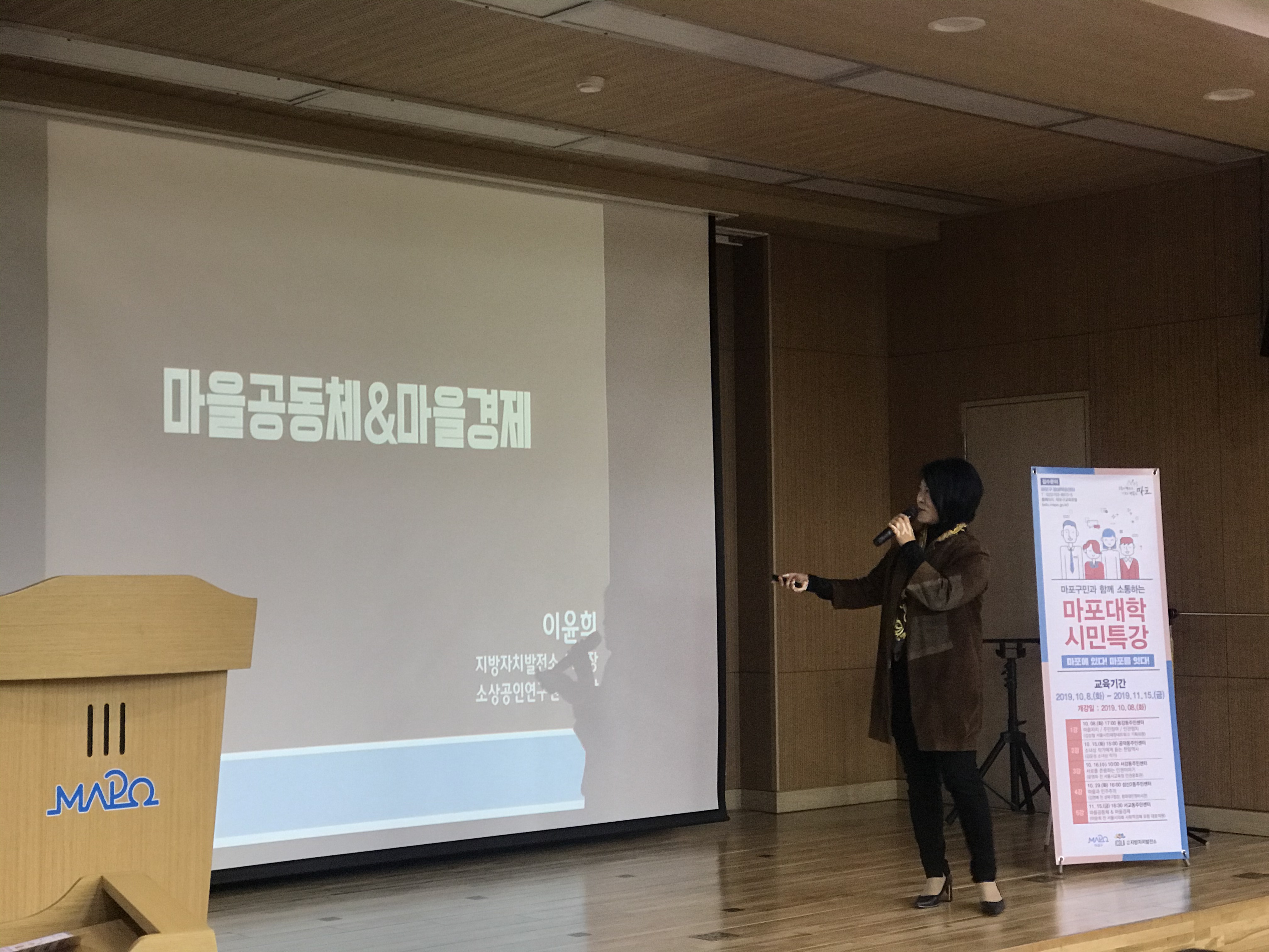 11월 15일 금요일 서교동 주민센터 강당에서 '마을공동체 & 마을경제' 라는 주제로, 마포대학 하반기 시민특강 마지막 강의가 있었습니다.