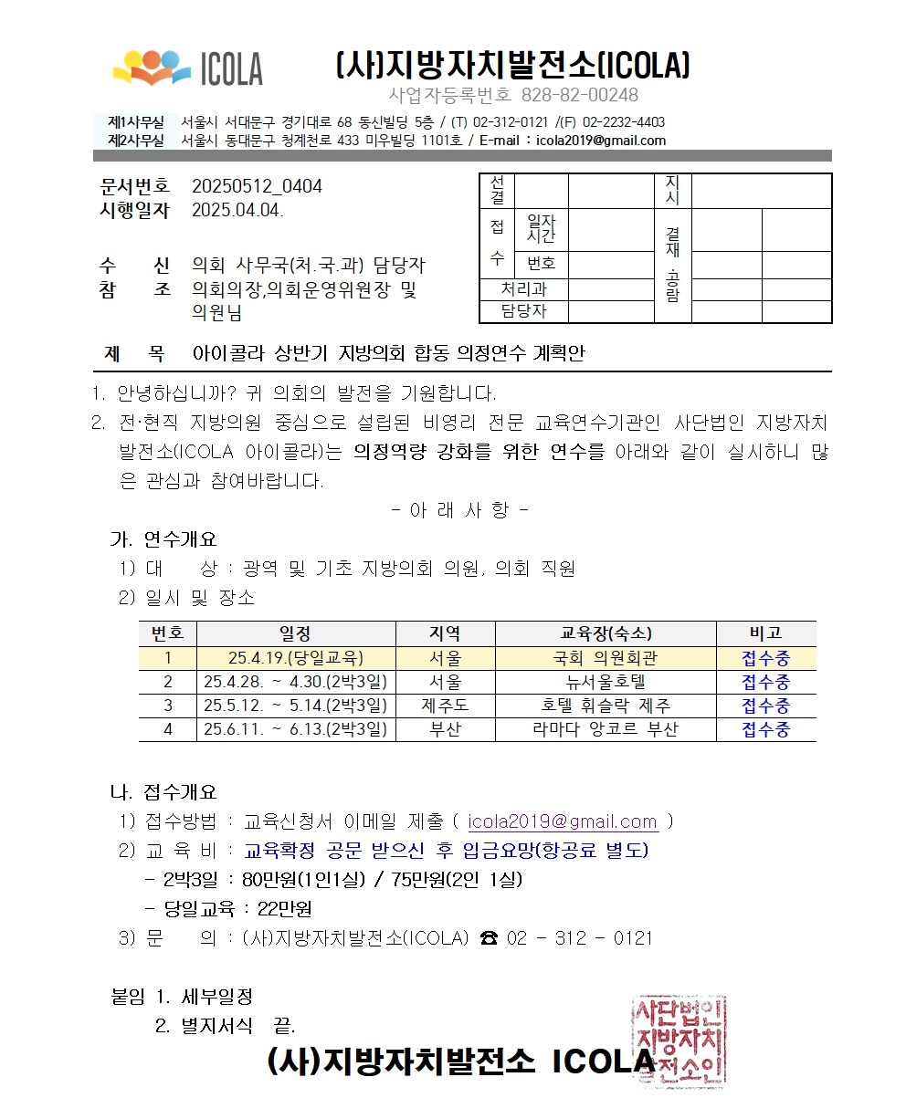 (사)지방자치발전소(ICOLA), 「 상반기 지방의회 합동 의정연수 」 진행합니다!