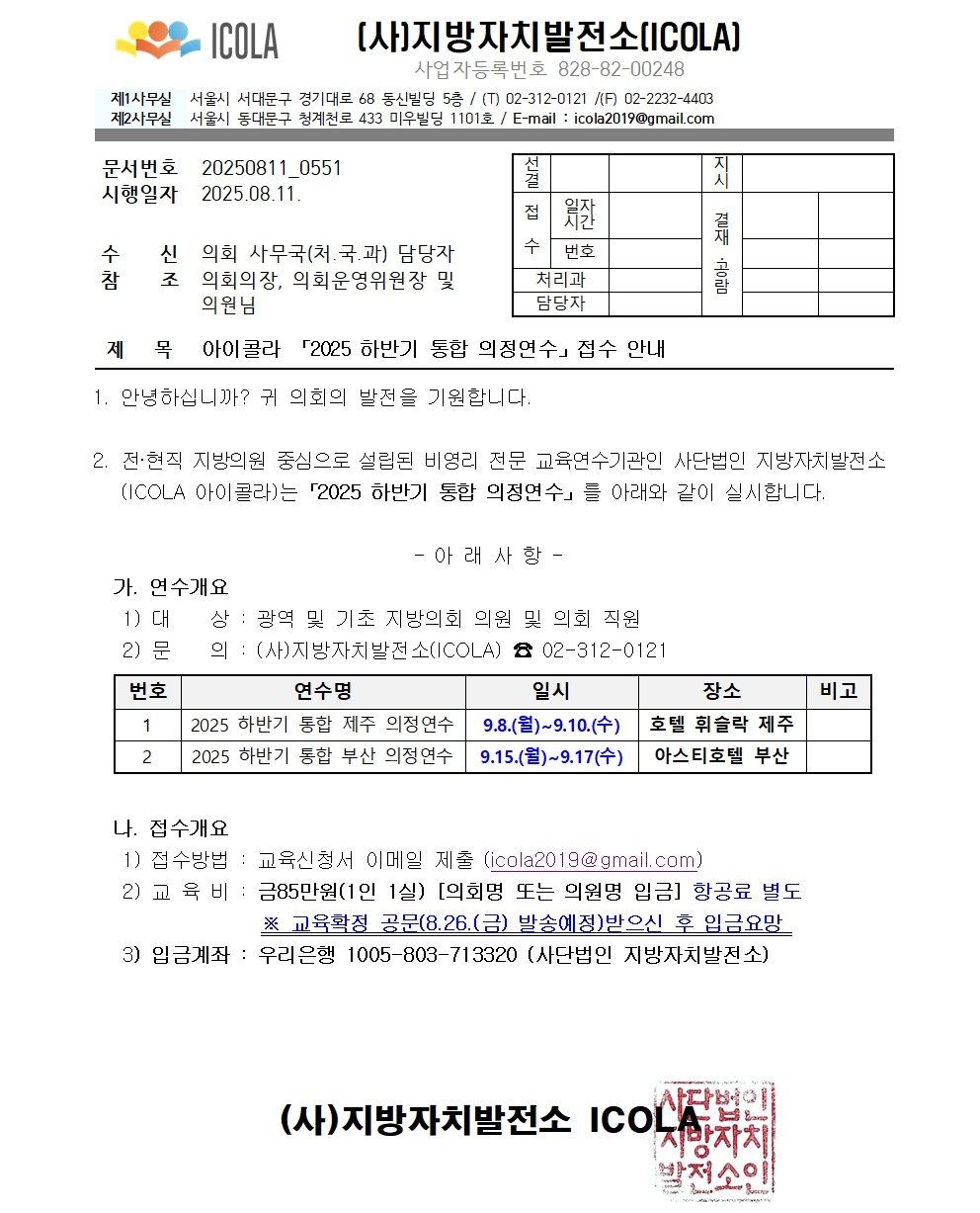 (사)지방자치발전소(ICOLA), 「2025 하반기 통합 의정연수」를 진행합니다!