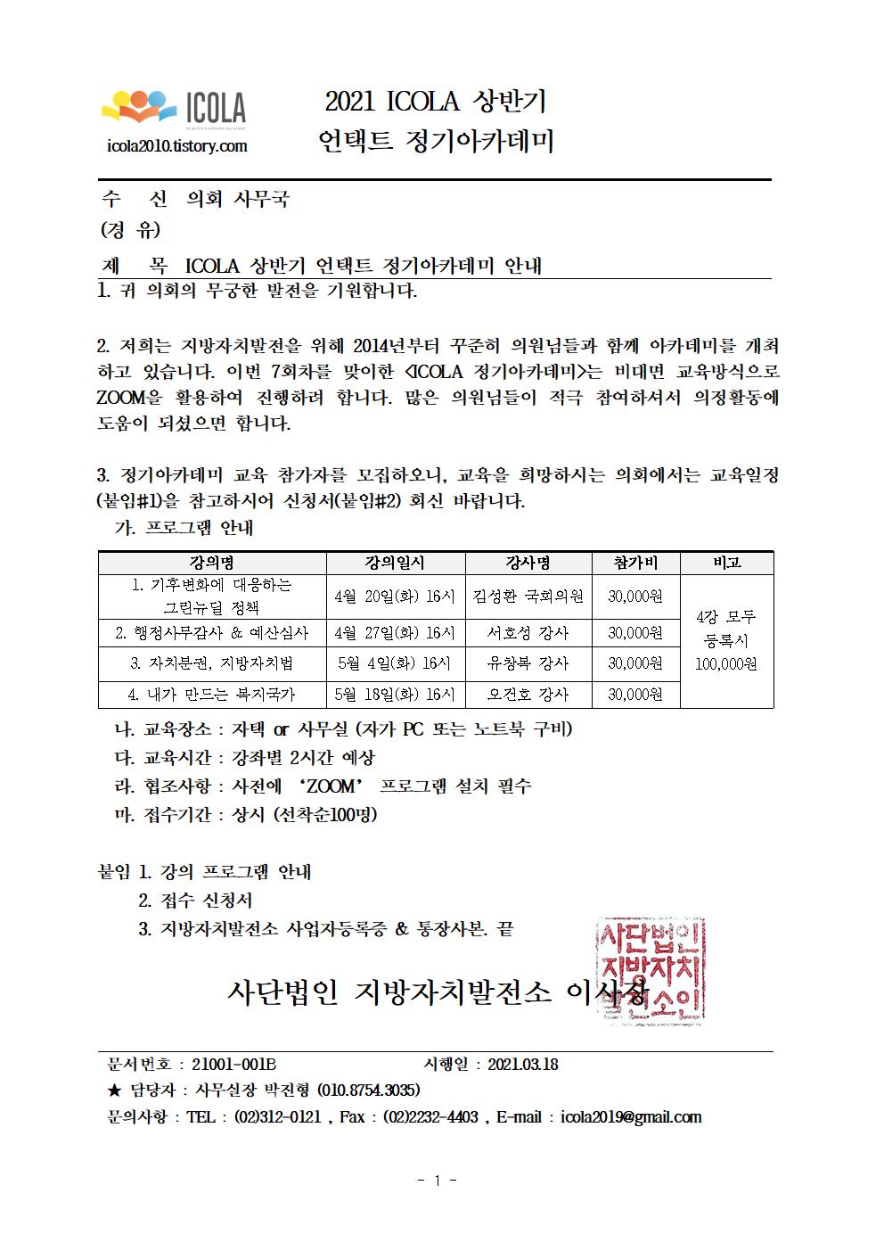 2021 지방자치발전소(ICOLA) 상반기 정기아카데미 교육 안내
