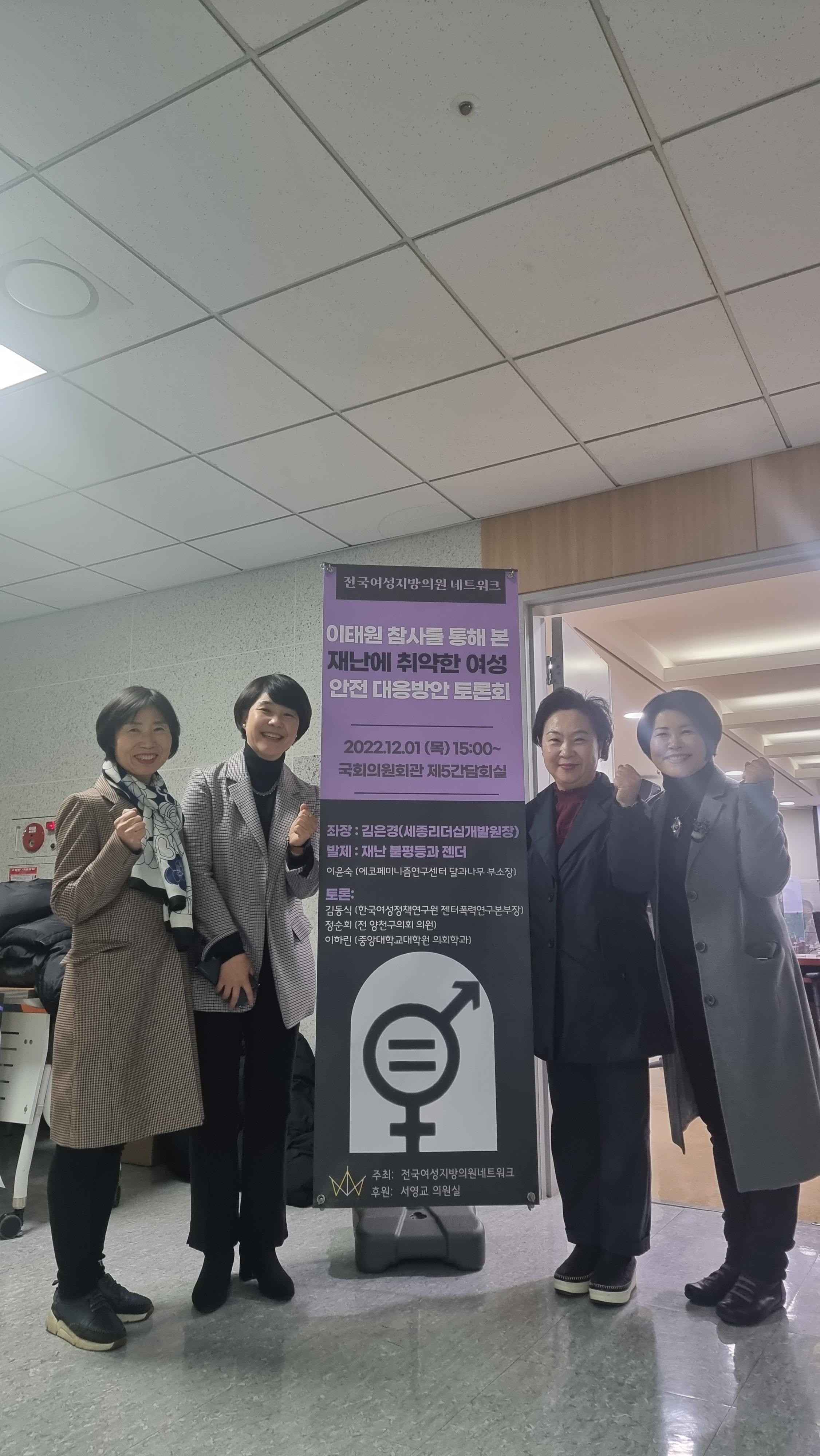 이태원참사에서 여성 사망자수가 약 64%에 이른 것을 주목해 재난에 취약한 여성의 안전 대응방안과 재난안전정책의 젠더적 접근의 필요성을 제기하며 121일 국회의원회관 제5간담회실에서 이태원참사를 통해 본 재난에 취약한 여성 안전 대응방안 토론회를 개최