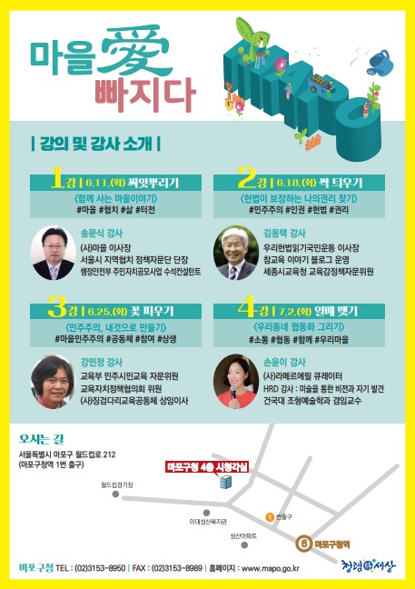 지방자치발전소는 마포 지역구민들을 대상으로, 마포대학에서 상반기 시민특강으로 주최하는 '마을愛 빠지다' 교육을 주관하였다. 지역구민들이 마을협치와 민주주에 대한 이해와 관심이 커지는 계기가 되었으며, ‘협동화 그리기’를 통하여 지역구민들도 본인이 생각을 표출해냄으로써 만족도가 높은 교육이었다.