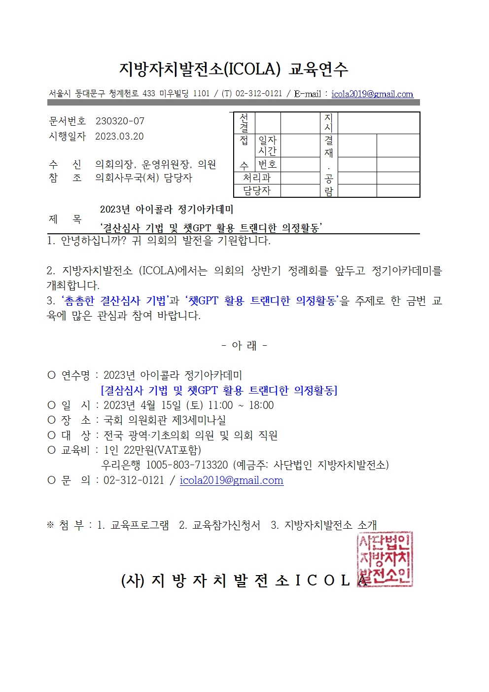 〇 연수명 : "결산심사 기법 및 챗GPT 활용 트랜디한 의정활동"_2023년 아이콜라 정기아카데미