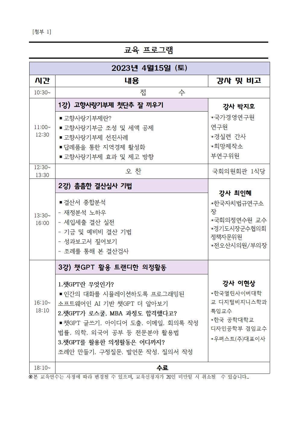 ‘촘촘한 결산심사 기법’과 ‘챗GPT 활용 트랜디한 의정활동’을 주제로 한 금번 교육에 많은 참여 바랍니다.
