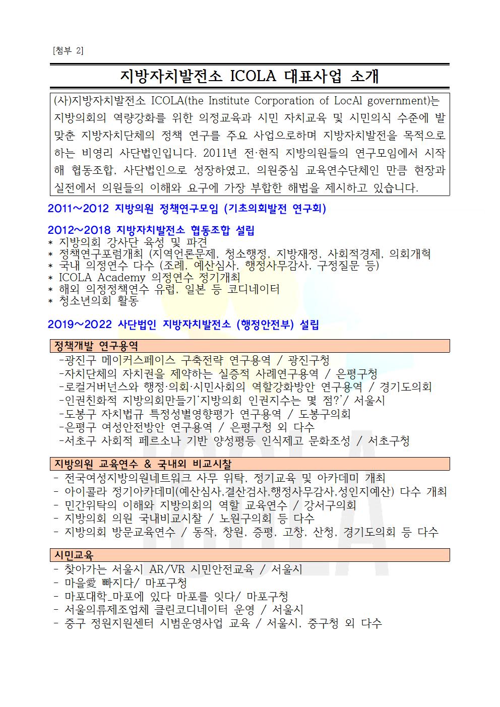◆ 이에 (사)지방자치발전소 (ICOLA)에서는 정책지원관의 의정지원 역량을 강화하기 위한 온라인 교육을 준비했습니다. 지방의원 출신의 강사와 전문위원을 통해 지방의원들이 실질적으로 원하는 의정지원에 대한 구체적·세부적인 노하우를 배우고 업무에 바로 적용할 수 있는 팁을 제공합니다. 정책지원관의 역량강화 교육에 많은 관심과 참여 바랍니다.