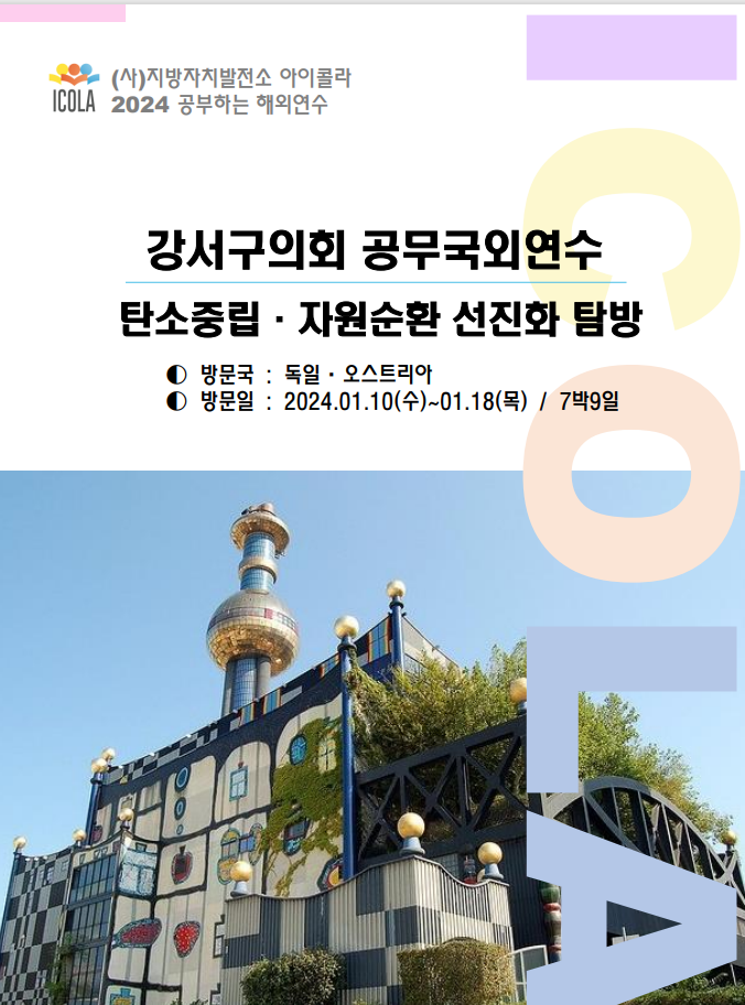 (사)지방자치발전소 (ICOLA)에서는 의회 상반기 정례회를 앞두고 제주연수를 개최합니다.〇 연수명 : 2024년 제주_결산심사 및 행정사무감사를 위한 의정연수〇 일 시 : 2024년 5월 20일 (월) ~5월 22일 (수)   오후 2시 개강〇 장 소 : 라마다제주시티홀_강의실 1층 미팅룸C / 객실 1인1실배정 / 전용차량이용〇 대 상 : 전국 광역·기초의회 의원 및 의회직원〇 교육비 : 1인 80만원(VAT포함)우리은행 1005-803-713320 (예금주: 사단법인 지방자치발전소)〇 문 의 : 02-312-0121 / icola2019@gmail.com/010-5878-5111