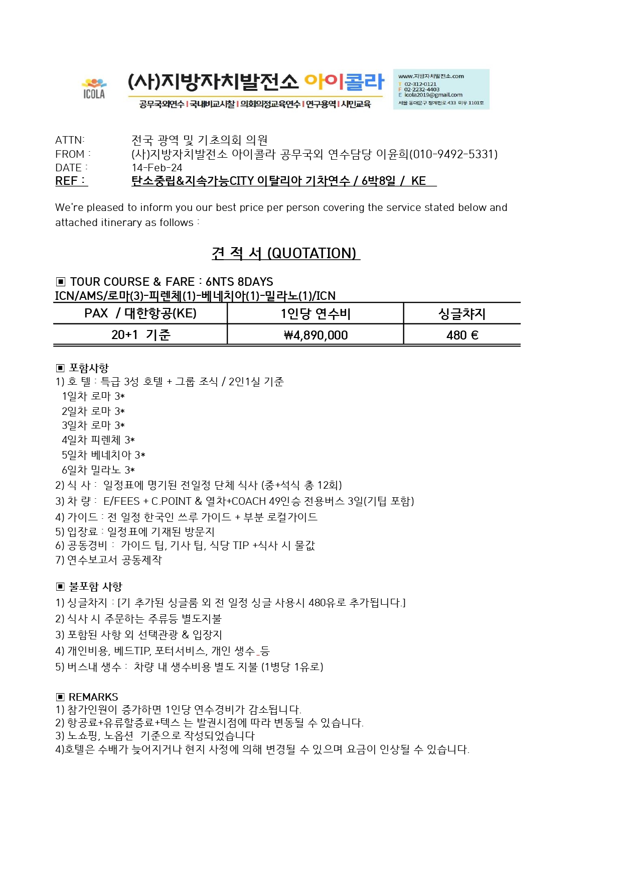2024년 아이콜라 공모연수 「탄소중립&지속가능CITY_이탈리아_기차 연수」 기차타고, 트램타고 이탈리아 한바퀴!! ▶ 방문국 : 이탈리아 ▶ 연수기간 : 2024년 5월14일(화)~21일(화) (6박8일) ▶ 1인당 연수비용 : 4,890,000원 (20인+인솔자포함 기준) ▶ 참가신청기간 : 2023년 2월29일까지 신청 (선착순 마감) ▶ 아래 참가신청서 다운로드 및 작성 후 이메일 접수 icola2019@gmail.com ▶ 문의 : 이윤희 사무총장 (010-9492-5331) ¶ [참가신청서] 아래 클릭 다운로드 후 작성 바랍니다.