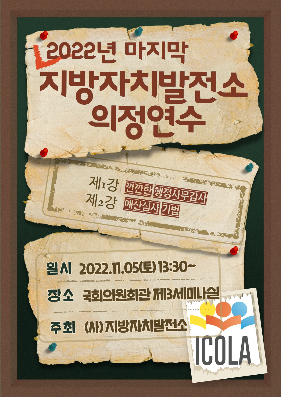 연수명 : 2022년 예산 및 행정사무감사 마지막 교육연수 일 시 : 2022. 11. 5 (토) 13:30~19:00 장 소 : 국회의원회관 제3세미나실 (서울특별시 영등포구 의사당대로 1) 대 상 : 지방의원 및 의회 공무원 이태원참사로 아까운 목숨을 잃은 고운 이들을 위한 묵념을 시작으로 통영에서, 울산에서, 청주에서, 원주에서, 세종, 인천, 경기, 서울 등 열심히 공부하는 의원님들이 모이셔서 열공중이십니다. 더더욱 국민의 혈세가 낭비됨없이 쓰여지도록 각자의 역할에 최선을 다하는 의원님들이 아름답습니다.