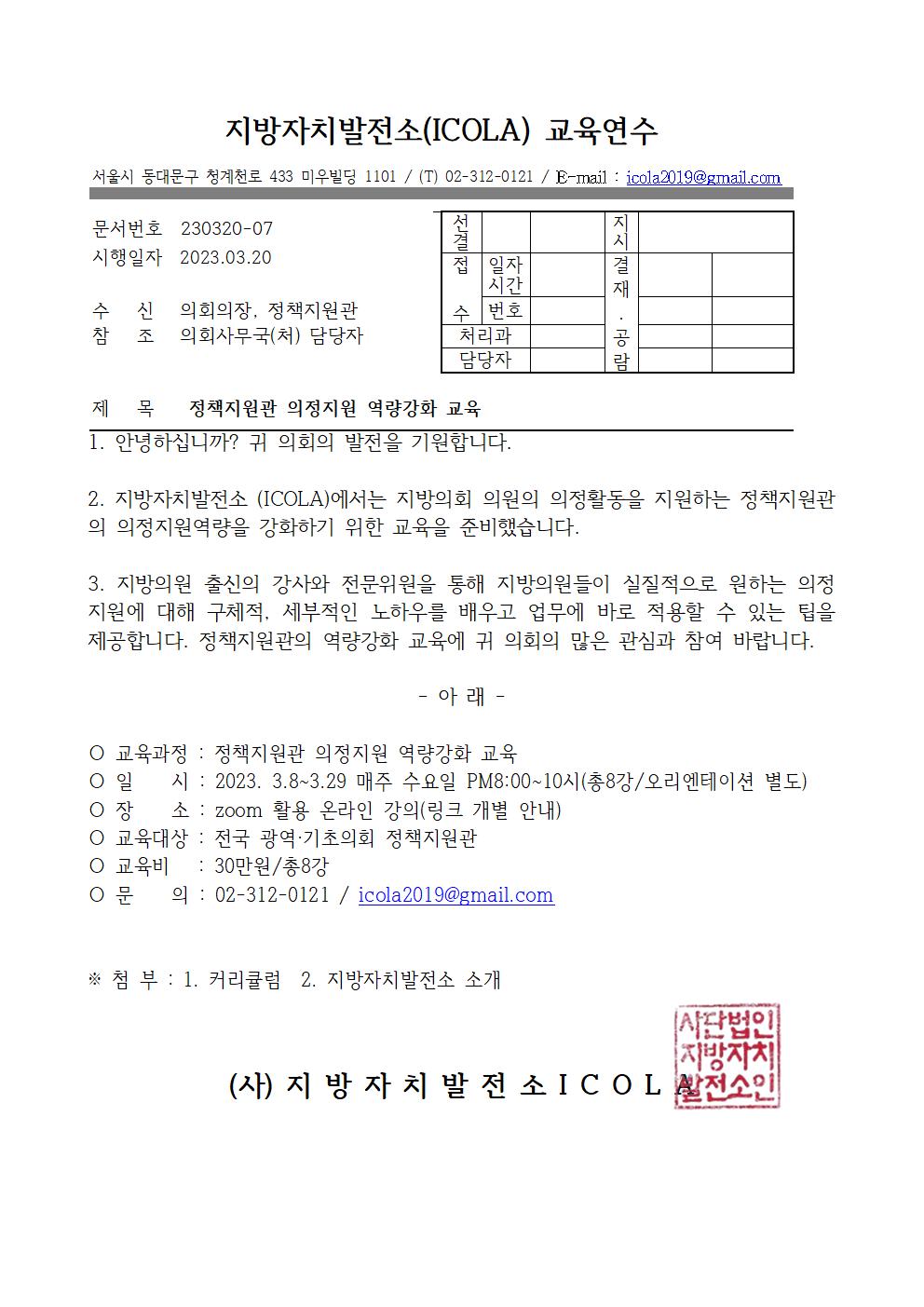 (사)지방자치발전소 (ICOLA)에서는 의회 상반기 정례회를 앞두고 정기아카데미를 개최합니다. ‘촘촘한 결산심사 기법’과 ‘챗GPT 활용 트랜디한 의정활동’을 주제로 한 금번 교육에 많은 참여 바랍니다. 〇 연수명 : "결산심사 기법 및 챗GPT 활용 트랜디한 의정활동"_2023년 아이콜라 정기아카데미 〇 일 시 : 2023년 4월 15일 (토) 11:00 ~ 18:00 〇 장 소 : 국회 의원회관 제3세미나실 〇 대 상 : 전국 광역·기초의회 의원 및 의회직원 〇 교육비 : 1인 22만원(VAT포함) 우리은행 1005-803-713320 (예금주: 사단법인 지방자치발전소) 〇 문 의 : 02-312-0121 / icola2019@gmail.com