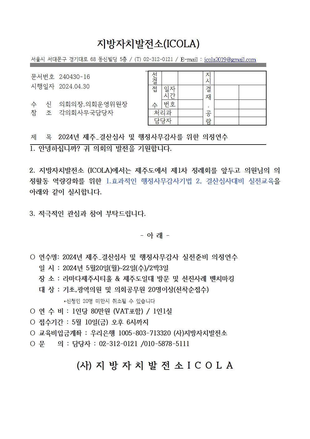 (사)지방자치발전소 (ICOLA)에서는 의회 상반기 정례회를 앞두고 제주연수를 개최합니다.〇 연수명 : 2024년 제주_결산심사 및 행정사무감사를 위한 의정연수〇 일 시 : 2024년 5월 20일 (월) ~5월 22일 (수)   오후 2시 개강〇 장 소 : 라마다제주시티홀_강의실 1층 미팅룸C / 객실 1인1실배정 / 전용차량이용〇 대 상 : 전국 광역·기초의회 의원 및 의회직원〇 교육비 : 1인 80만원(VAT포함)우리은행 1005-803-713320 (예금주: 사단법인 지방자치발전소)〇 문 의 : 02-312-0121 / icola2019@gmail.com/010-5878-5111