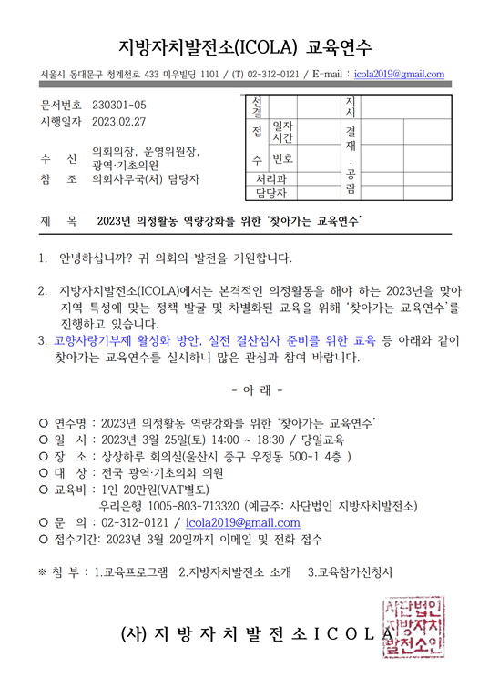 (사)지방자치발전소 (ICOLA)에서는 의회 상반기 정례회를 앞두고 제주연수를 개최합니다.〇 연수명 : 2024년 제주_결산심사 및 행정사무감사를 위한 의정연수〇 일 시 : 2024년 5월 20일 (월) ~5월 22일 (수) 오후 2시 개강〇 장 소 : 라마다제주시티홀_강의실 1층 미팅룸C / 객실 1인1실배정 / 전용차량이용〇 대 상 : 전국 광역·기초의회 의원 및 의회직원〇 교육비 : 1인 80만원(VAT포함)우리은행 1005-803-713320 (예금주: 사단법인 지방자치발전소)〇 문 의 : 02-312-0121 / icola2019@gmail.com/010-5878-5111