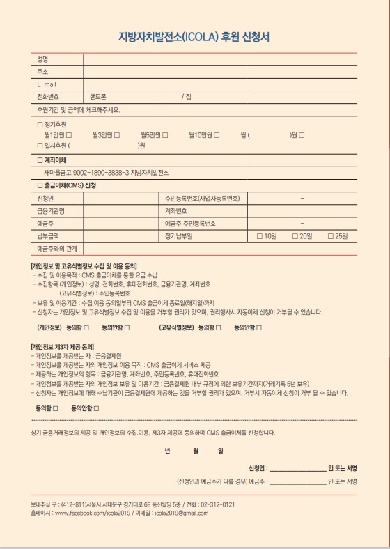 정기 후원하기 (사) 지방자치발전소와 동행해 주세요!! 지방자치발전소(ICOLA)는 전·현직 지방의원들이 만든 행정안전부 스인 비영리 사단법인입니다. 지방의원의 경험을 통해 지방자치의 발전을 위한 지방의회의 중요함을 누구보다 잘 알고 있습니다. 지방의회, 지방의원 역량강화를 위한 교육사업부터 시민 자치교육과 민주주의교육, 시민의식 수준에 발맞춘 지방정부의 정책 연구를 주요 목적사업으로 하여 자치분권의 온전한 실현을 위해 늘 노력하겠습니다. 지방자치발전소(ICOLA) 정기후원 회원이 되시면! 지방자치발전소(ICOLA) 주최 각종 캠페인 및 교육에 참여합니다. (유료프로그램 참여시 할인혜택 등) 다양한 회원모임과 지역모임에 참여하실 수 있습니다. 지방자치발전소(ICOLA)는 행안부 지정기부금단체로 연말정산시..