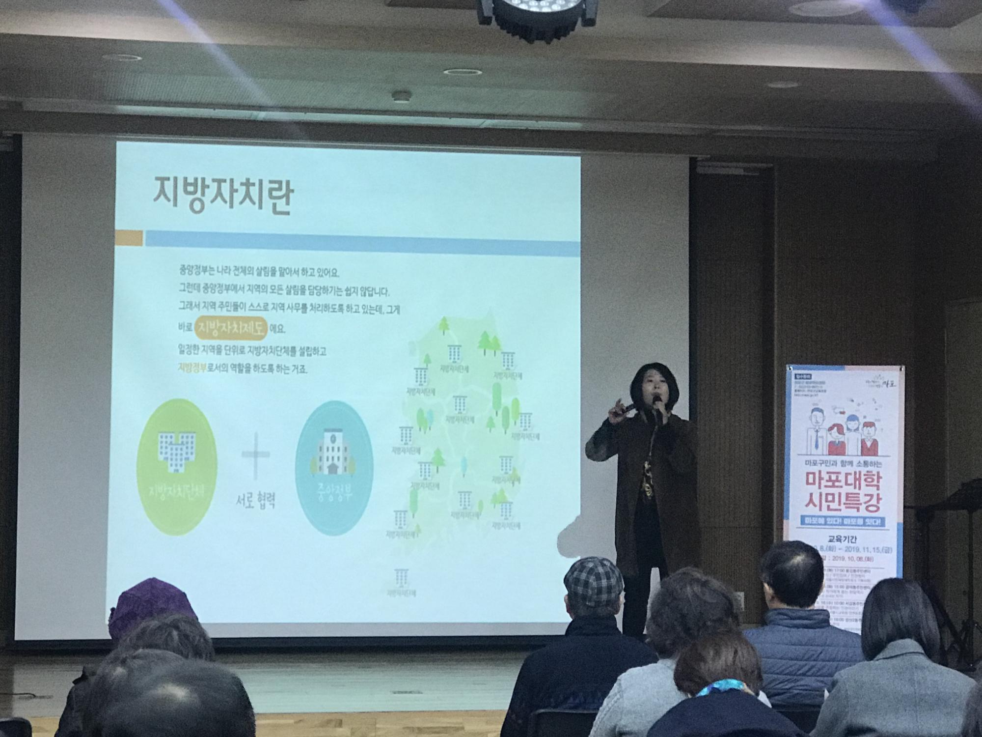 11월 15일 금요일 서교동 주민센터 강당에서 '마을공동체 & 마을경제' 라는 주제로, 마포대학 하반기 시민특강 마지막 강의가 있었습니다. 하반기 마지막 교육인만큼 마포 유동균 구청장께서도 직접 참석해주셔 자리를 빛내주셨습니다. 비록 길지 않은 시간이었지만 마포구민들과 소통하는 소중한 시간을 가졌습니다. 이 날은 마포의 망원1동, 망원2동, 서교동 주민 70명이나 되는 많은 인원이 참석하여 강의를 듣고 질의응답을 가졌으며, 강의가 끝난 뒤 강의평가에서도 아주 좋은 평가를 받았습니다. 이윤희(지방자치발전소 이사장) 강사를 통해 마포 지역자치에 대한 구민들에 대한 긍정적인 인식전환과 마을공동체의 중요성을 배우는 유익한 시간이었습니다.