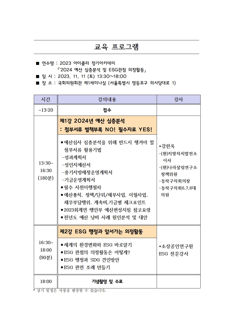 (사)지방자치발전소 ICOLA에서는 제2차 정례회를 앞두고 지방의회의원님의 의정활동과 직무에 도움이 되는 1. 의회메커니즘과 액티비티의정활동 2. 2024년 예산 심층 분석_첨부서류 활용법 3. ESG 행정과 의정활동 등에 관한 교육을 실시합니다. ●연수명 : 아이콜라 정기아카데미_'2024 예산 심층분석 및 ESG관점 의정활동 ●일시 : 2023년 11월10일(금)~11일(토) ●장소 : (사)지방자치발전소 & 국회의원회관 제1세미나실 ●교육비 : 40만원 ●입금계좌 : 우리은행 1005-803-713320 (사단법인 지방자치발전소) ●접수방법 : 교육신청서 이메일 제출 ( icola2019@gmail.com )