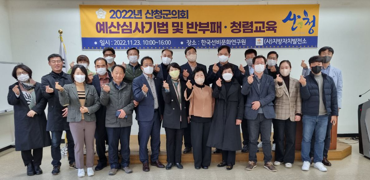 〇연수명 : 산청군의회 예산심사기법 및 반부패·청렴교육 〇일 시 : 2022. 11. 23(수) 10:00~16:00 〇장 소 : 한국선비문화연구원 (경남 산청군 시천면 남명로 240번길 33) 〇대 상 : 산청군의회의원 및 의회공무원 20명 〇주 최 : (사) 지방자치발전소 (ICOLA) 〇강 의 : 제1강 예산이 곧 행정, 예산심사 핵심노하우 제2강 처음부터 제대로, 공직자라면 알아야 할 의무교육 청탁금지법,이해충돌방지법 중심 산좋고, 물좋고, 인심좋은 경남 산청군의회 하루연수 빡빡한 교육시간에도 흐트러짐없이 집중하는 의원님들과 의회 공무원들의 열정에 감동받는 하루였습니다. 동의보감촌 명소화를 위해 해쓰는 산청, 흑돼지와 딸기가 유명한 산청군의 발전을 기원드립니다.