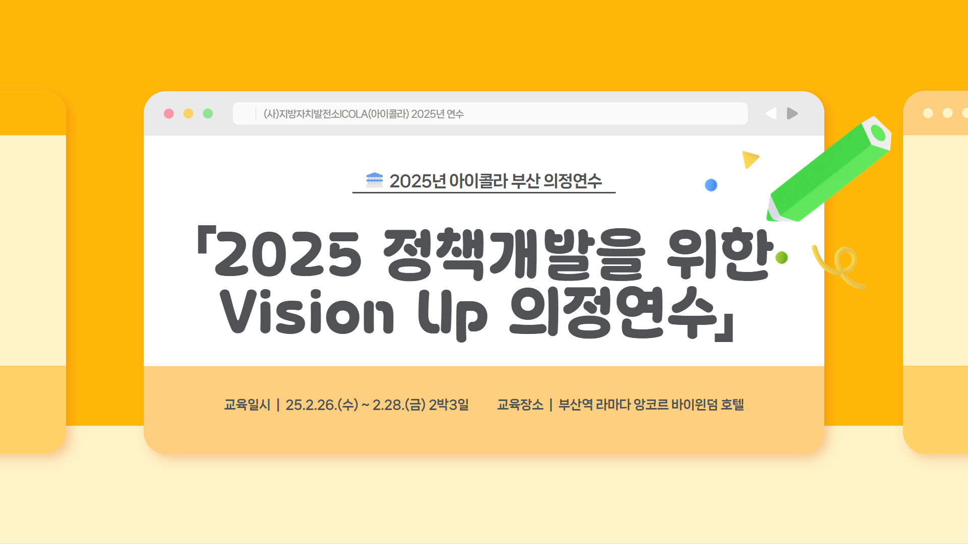 (사)지방자치발전소(ICOLA), 「2025 정책개발을 위한 Vision Up 의정연수」 부산에서 진행합니다!✔️ 일시 | 2025.2.26.(수) 14:00 ~ 2.28.(금) 13:00 2박3일         ✔️ 장소 | 부산역 라마다 앙코르 바이윈덤 호텔✔️ 대상 | 광역 및 기초 지방의회 의원 및 의회 직원✨ 접수마감| 2025.2.14.(금) 18:00까지✨ 접수방법|교육참가신청서 작성 후 이메일 제출( icola2019@gmail.com )✔️ 교육비| 금 80만원 (1인1실) / 금 75만원 (2인1실) [의회명 또는 의원명 입금]✔️ 입금계좌| [우리은행] 1005-803-713320 (사단법인 지방자치발전소)                         2. 15. 교육확정 공문 받으신 ..